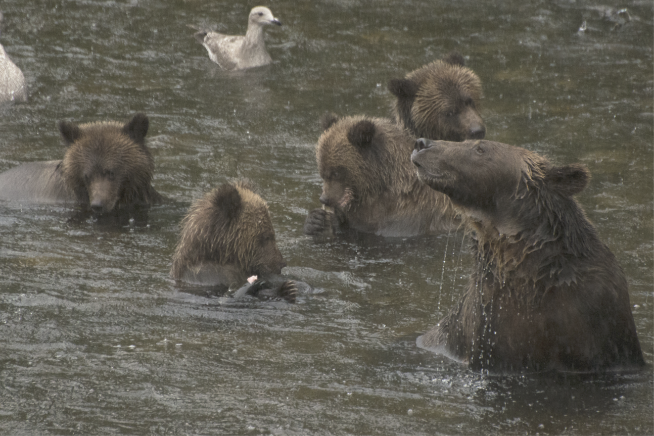 As the grizzly bears in the area come down from their winter hibernation in the mountains, they come down in higher density in food dense coastal areas. Moms with cubs and sub-adults alike are often on the move, negotiating around mating adult bears.